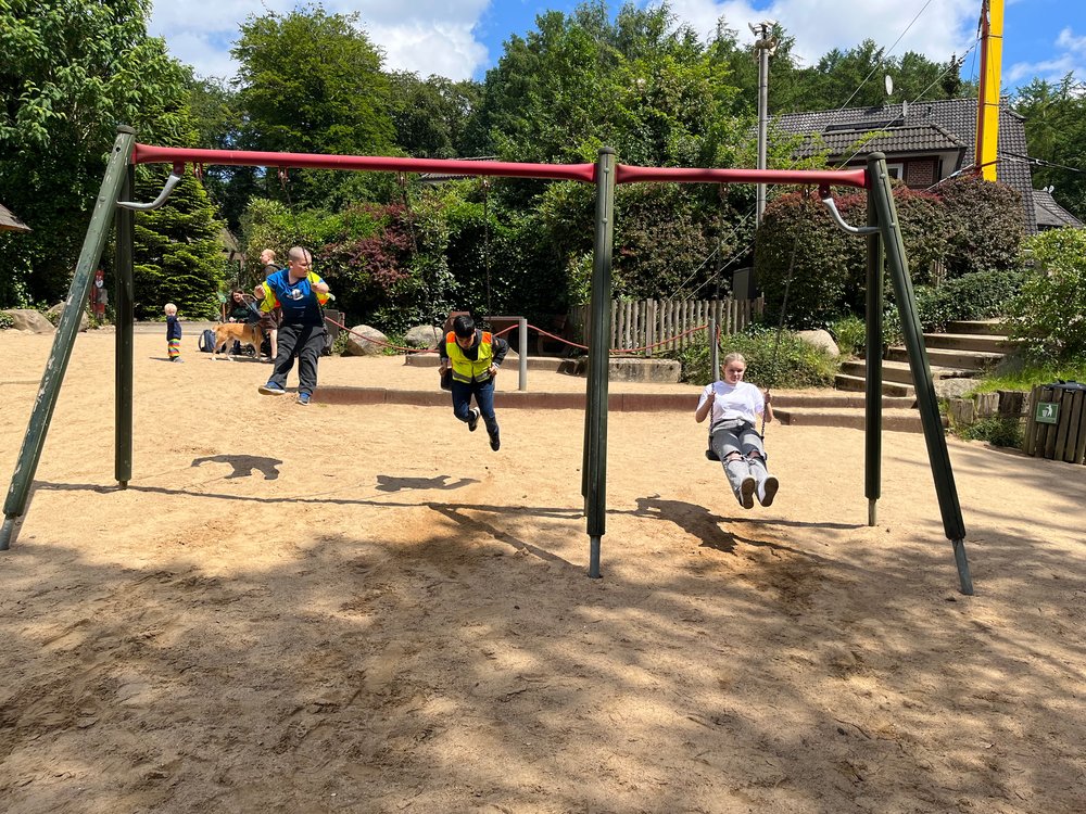 Bevor es zurück zur Schule geht, dürfen wir noch den großen Spielplatz erkunden. Wir flitzen von einem Spielgerät zum nächsten und dürfen schaukeln, Karussell fahren, klettern und rutschen!