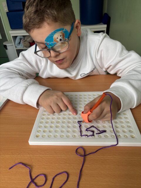 Weiteres Arbeitsmaterial wäre ein sensorisches Einfädelbrett, welches die Auge- Hand- Koordination fördert sowie den Ablauf des Zusammenspiels der Blickrichtung , der Druckverhältnisse und Geschicklichkeit darstellt , mit der auch ein Stift beim Schreiben geführt werden muss .