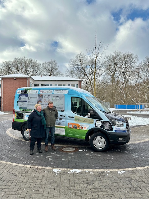In ihrer Dankesrede blickte Schulleiterin Dorit Brandt zunächst auf den bisherigen Bus zurück, der im Dezember „in Rente“ gegangen ist. Und dieser hatte einiges erlebt: Klassenfahrten an die Ostsee, die Fahrt zu den Special Olympics nach Berchtesgaden im Winter, zahlreiche Ausflüge und Turniere unserer Fußballer. Auch das Greenteam war regelmäßig mit ihm unterwegs – sei es für Besorgungen oder Arbeiten im Auftrag der Schulbehörde. Selbst Kolleginnen und Kollegen nutzten den Bus bei Bedarf. Man kann mit Recht sagen: Er war ein echter Alltagsheld.